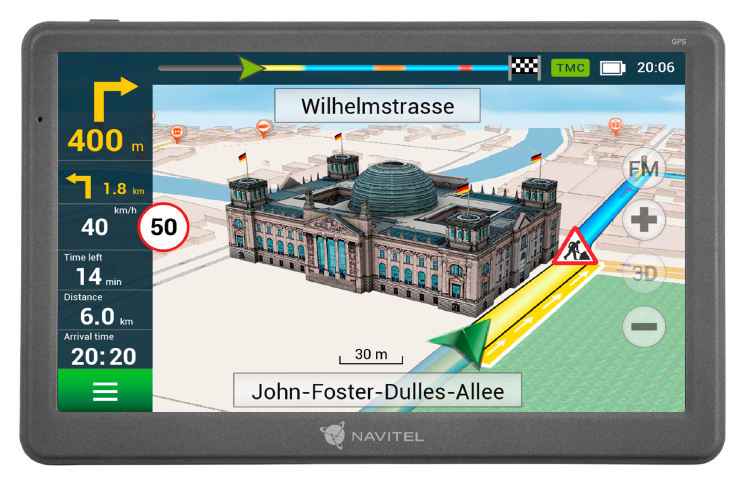 NAVITEL E700 TMC is a car navigator with Traffic Messaging Channel technology (TMC). With this function, a car owner recieves real-time information about traffic jams and adverse conditions, allowing the calculation of an alternative route to make a detour around problem areas.